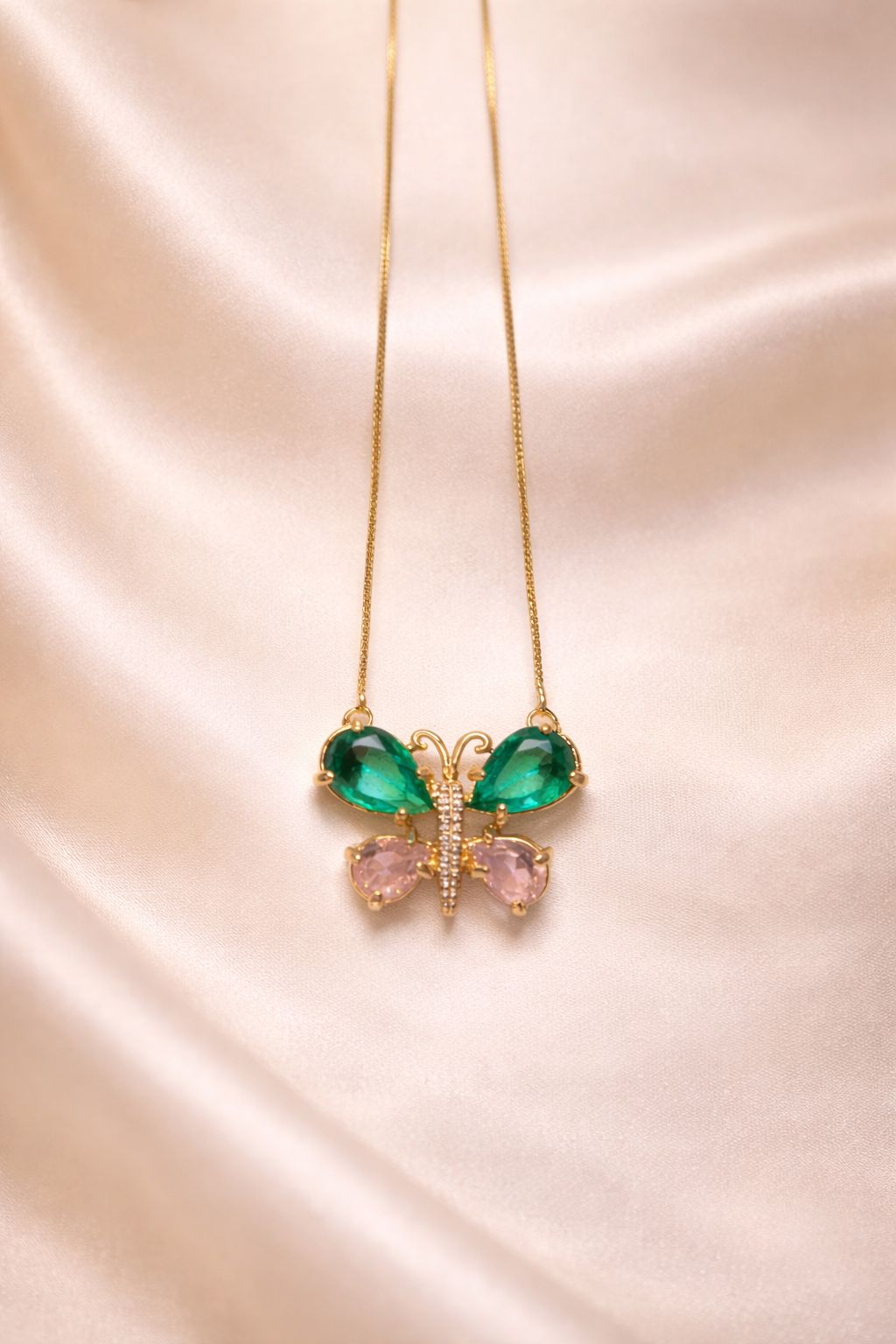 Colar feminino 45 cm com pingente borboleta pedra rosa e verde 2,5 cm com 7 milésimo de ouro