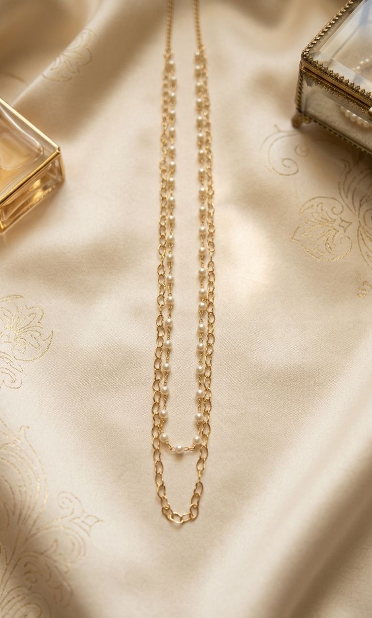 Colar feminino Duplo coração vazado e pérola 48 cm com 7 milésimo de ouro