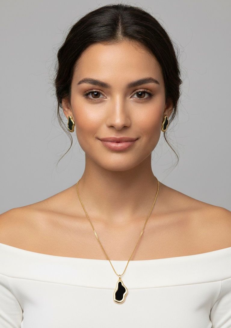 Peça composta por um par de brinco cor preto 1 cm, 1 corrente veneziana 22 cm+extensor 5,5cm e pingente preto 1 cm
