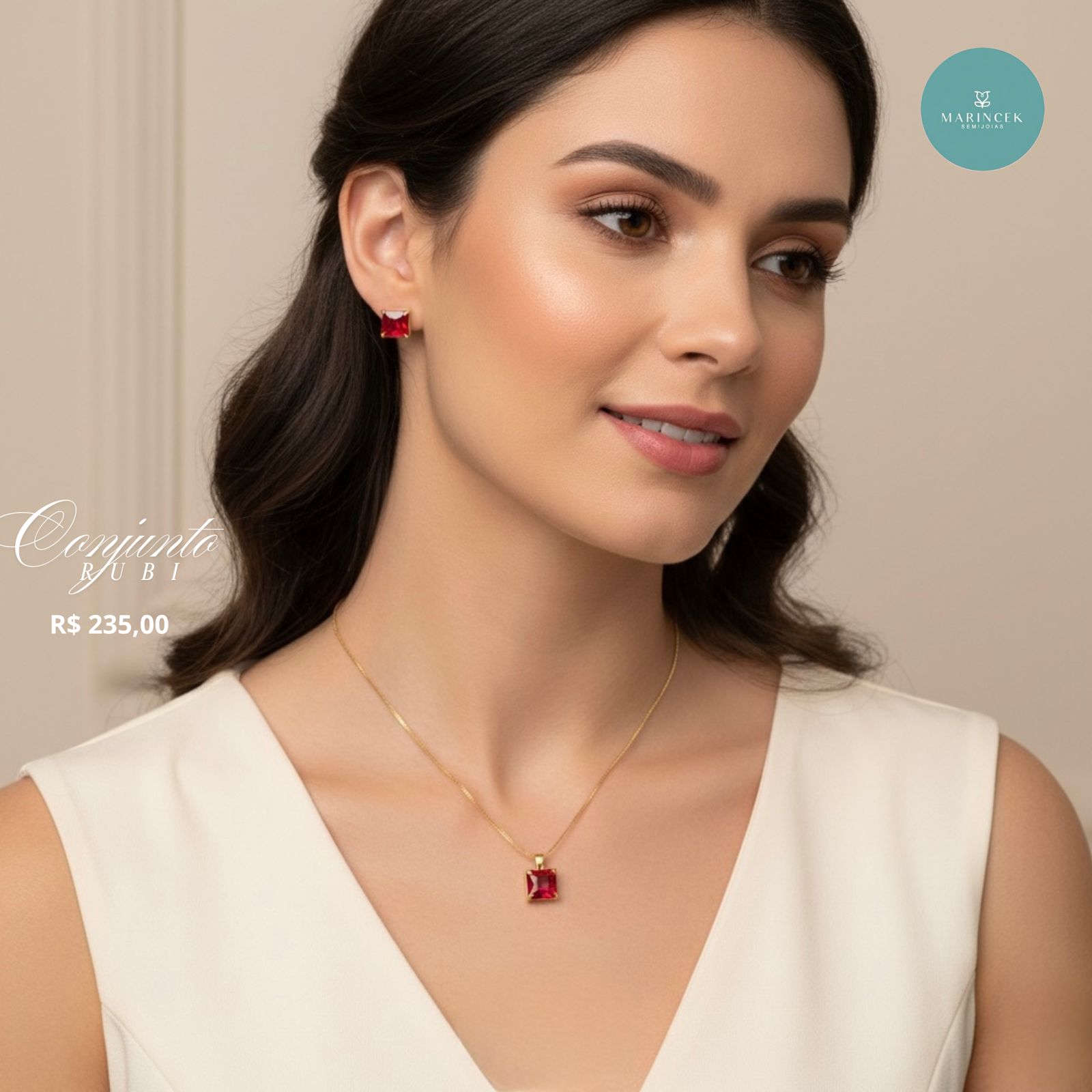 Peça composta por um par de brinco pedra vermelha 1cm, 1 corrente veneziana 20cm+extensor 5,5 cm e pingente pedra vermelha 1cm