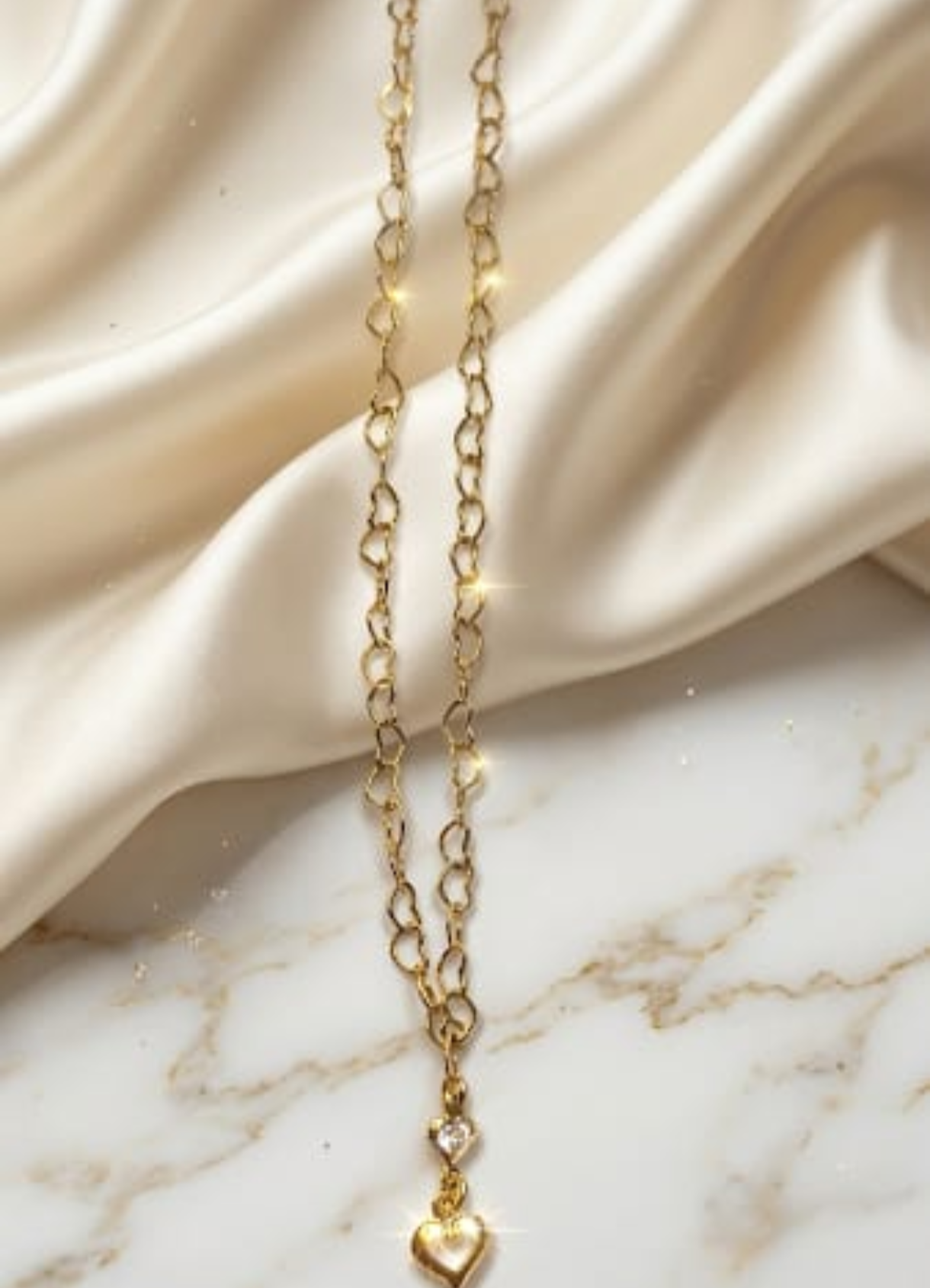 Tornozeleira feminina com pedra e coração vazado 26 cm extensor 5 cm com 7 milésimo de ouro